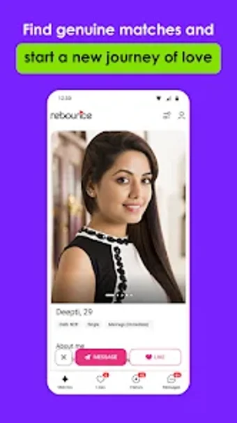 Rebounce Matchmaking adalah aplikasi matrimoni yang dirancang khusus untuk individu yang bercerai atau menjanda yang ingin menemukan cinta baru. Dengan antarmuka yang sederhana, pengguna dapat membuat profil, mengunggah foto, dan mengatur preferensi seperti usia, agama, dan lokasi. Aplikasi ini menawarkan berbagai fitur, termasuk saran dari pencari jodoh profesional, serta kemampuan untuk menjelajahi profil dari seluruh India, termasuk kota-kota besar seperti Mumbai dan Delhi.